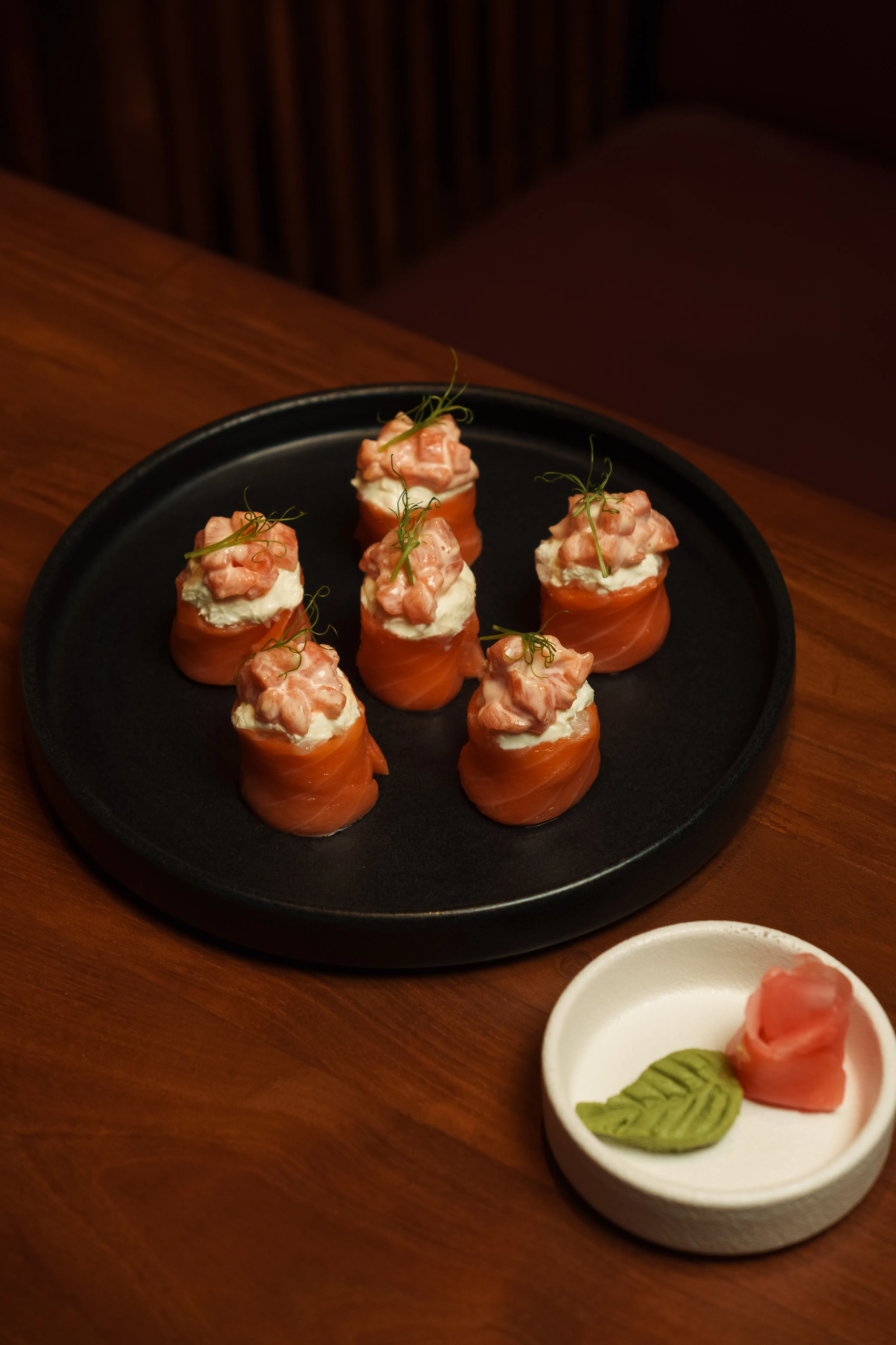 Deep-fried sushi roll topped with baked spicy salmon and creamy volcano sauce.
