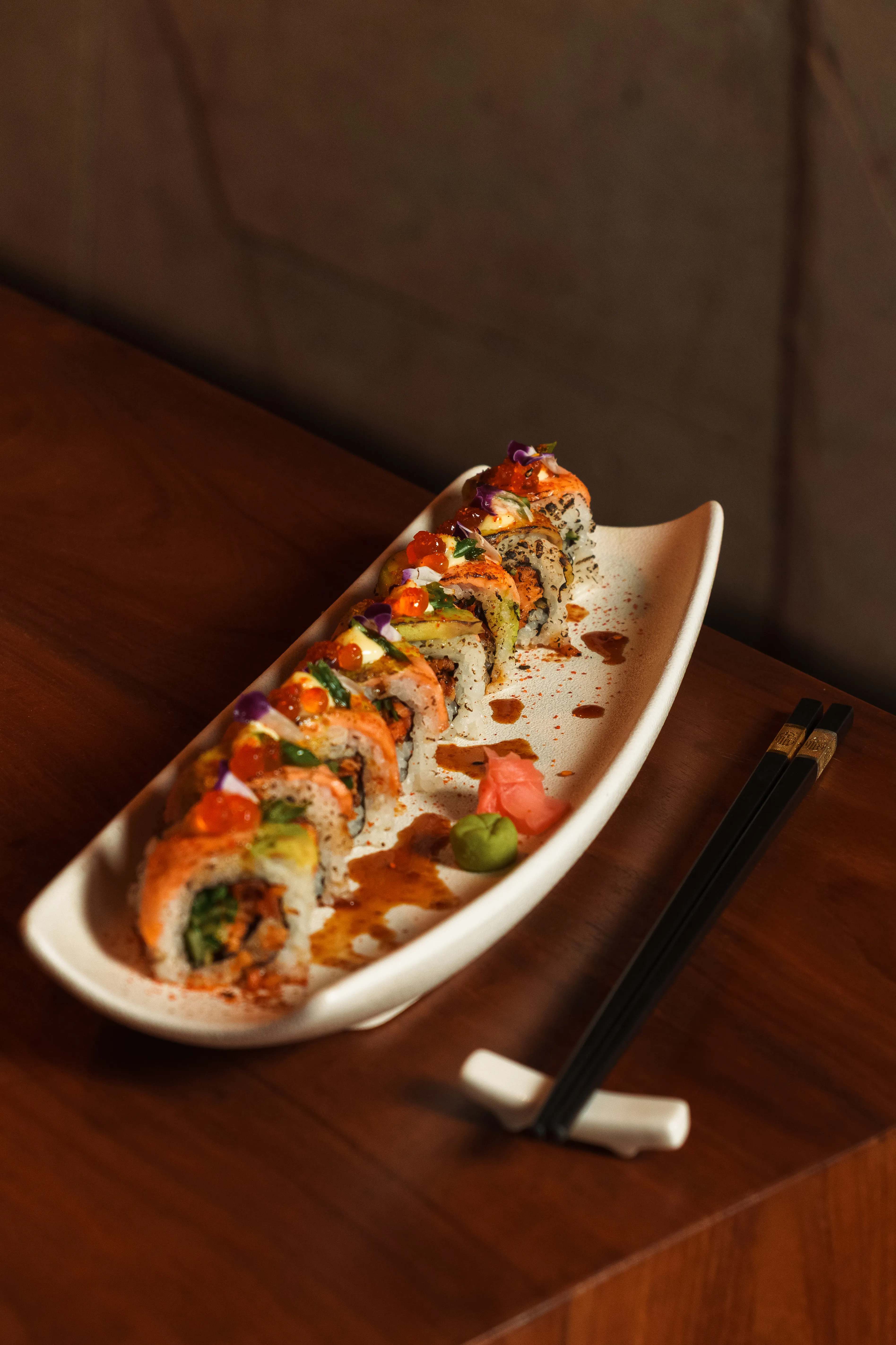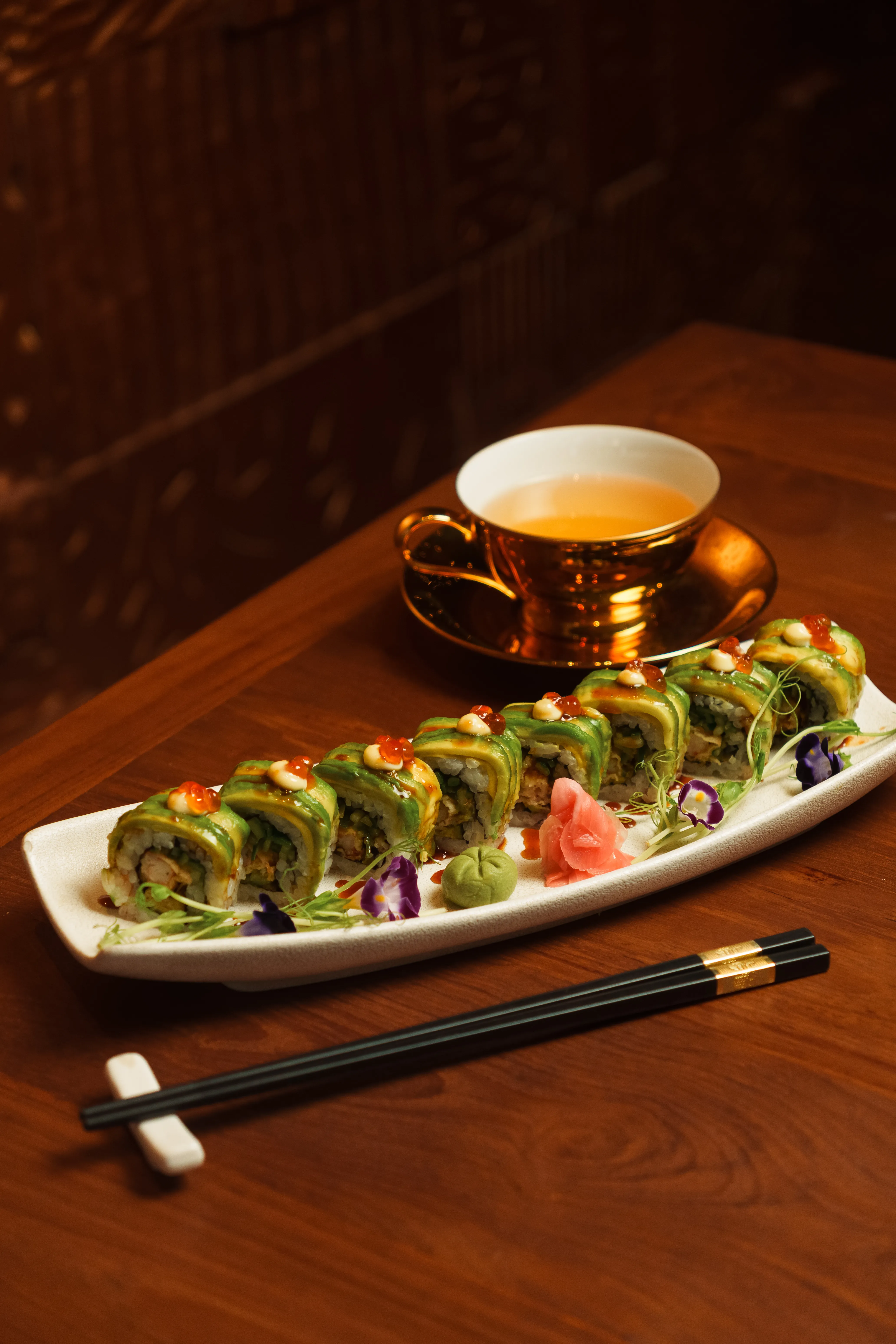 Prawn tempura roll topped with avocado, cucumber, and a drizzle of signature sauce.